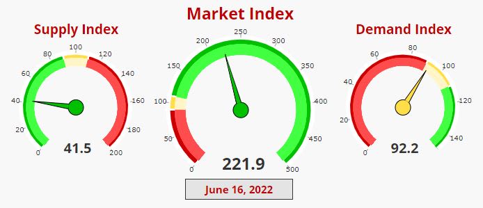 100 is balanced and prices rise at the rate of inflation (currently 8.6%), below 100 is a buyer’s market, above 100 is a seller’s market, prices drop below 90, prices rise at 110.